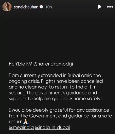 Sonal Chauhan In Dubai: मिडिल ईस्ट में बढ़े तनाव के कारण सभी एयरलाइंस कंपनियों ने दुबई की सभी फ्लाइट कैंसिल कर दी है. इसके कारण बॉलीवुड एक्ट्रेस सोनल चौहान दुबई में ही फंस गई हैं. अब एक्ट्रेस ने सोशल मीडिया के जरिए प्रधानमंत्री नरेंद्र मोदी से भारत लौटने में मदद की गुहार लगाई है.