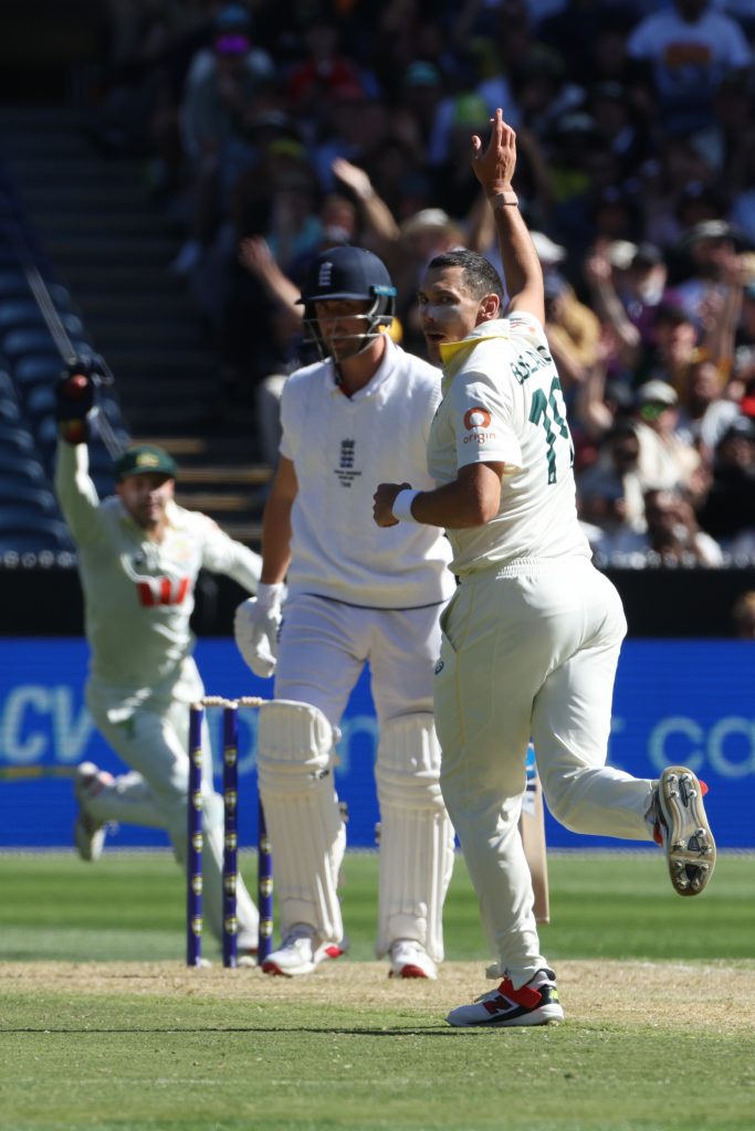 ऑस्ट्रेलिया ने पहले 6 ओवर में 27 रन बनाए. इसके बाद ट्रेविस हेड (12) को गुस एटकिंसन ने सस्ते में आउट किया. टंग ने जेक वेदराल्ड (10) को पवेलियन भेजा और उनका अगला शिकार मार्नस लाबुशेन (6) बने जो पहली स्लिप में कैच देकर लौटे. ऑस्ट्रेलिया के 3 विकेट 34 रन पर गिर गए थे. कप्तान स्टीव स्मिथ को टंग ने जब आउट किया तब स्कोर 51 रन था. अनुभवी उस्मान ख्वाजा 29 रन बनाकर एटकिंसन की गेंद पर आउट हुए. उस समय स्कोर 5 विकेट पर 89 रन था और 2 रन बाद एलेक्स कैरी ने गली में कैच थमा दिया. नेसेर (35) और कैमरन ग्रीन (17) ने 52 रन की साझेदारी की लेकिन ग्रीन के रन आउट होने पर यह साझेदारी टूट गई. टंग ने नेसेर और स्कॉट बोलैंड (0) को अपने 12वें ओवर की पहली 2 गेंदों पर आउट किया.