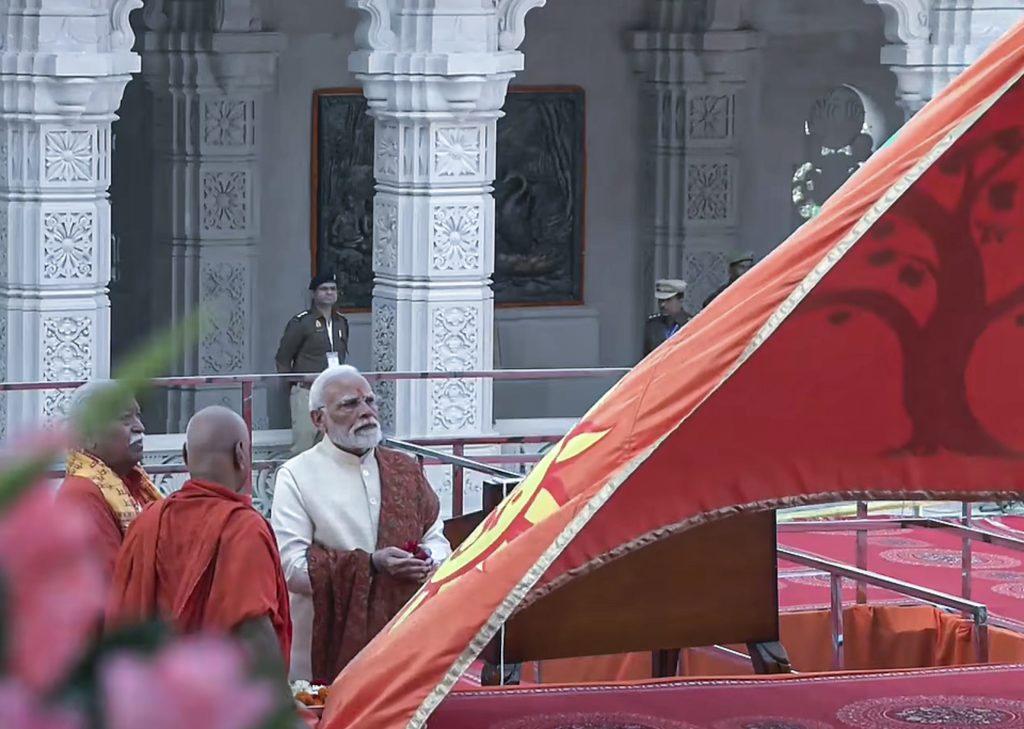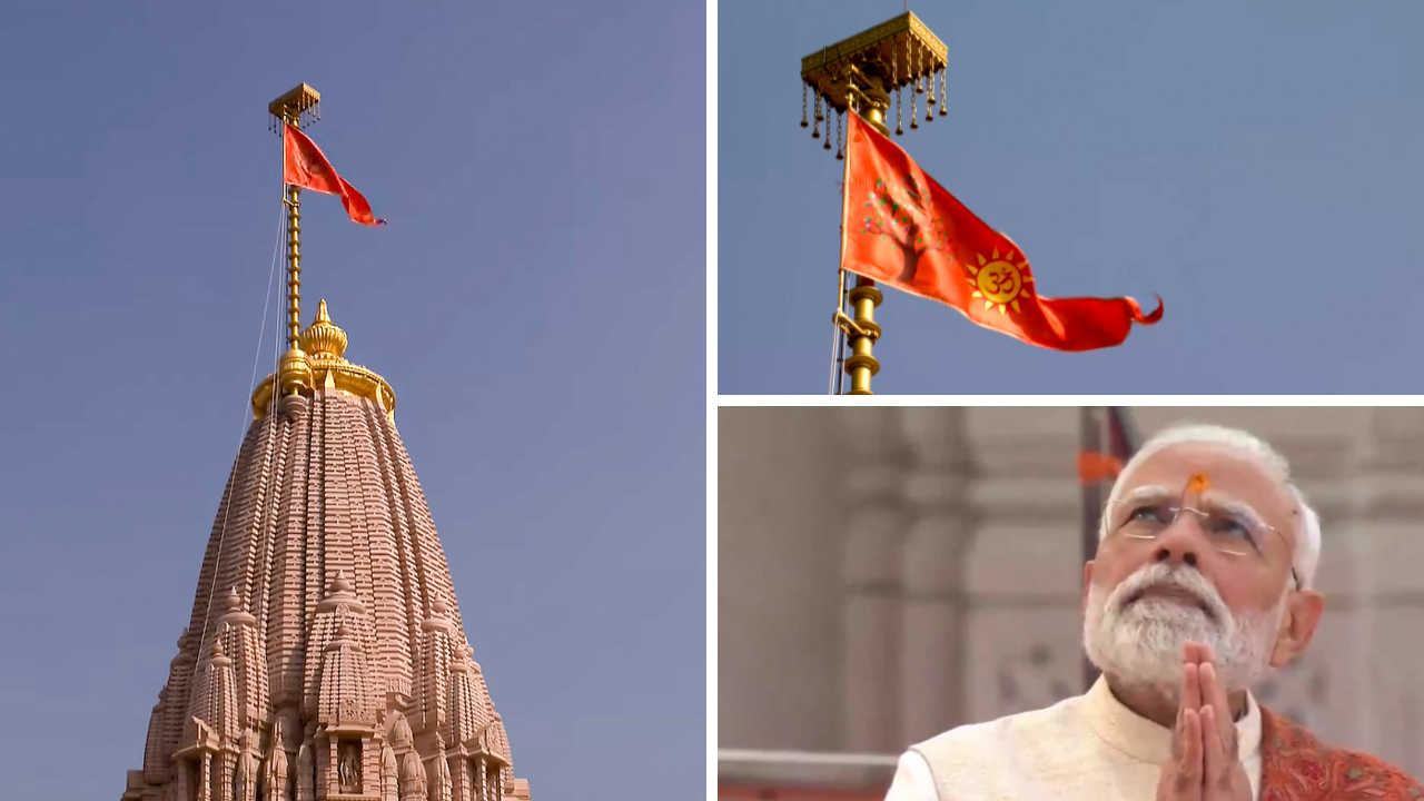 Ayodhya Ram Mandir Dhwajarohan: प्रधानमंत्री नरेन्द्र मोदी ने मंगलवार को अयोध्या में श्रीराम जन्मभूमि मंदिर के शिखर पर वैदिक मंत्रोच्चार और ”जय श्री राम” के नारों की गूंज के बीच भगवा ध्वज फहराया. इस अनुष्ठान के साथ ही मंदिर का निर्माण औपचारिक रूप से पूरा हो गया. प्रधानमंत्री मोदी ने मार्गशीर्ष मास के शुक्ल पक्ष की पंचमी तिथि पर भगवान श्रीराम और मां सीता की ‘विवाह पंचमी’ के अभिजीत मुहूर्त पर तिकोने झंडे का आरोहण किया. इस मौके पर राष्ट्रीय स्वयंसेवक संघ के सरसंघचालक मोहन भागवत और उत्तर प्रदेश के मुख्यमंत्री योगी आदित्यनाथ भी मौजूद रहे.