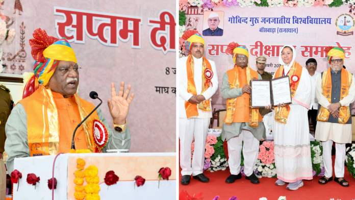 गोविंद गुरु जनजातीय विश्वविद्यालय का सातवां दीक्षांत समारोह आयोजित किया गया. कार्यक्रम में राज्यपाल एवं कुलाधिपति हरिभाऊ बागड़े मुख्य अतिथि के रूप में मौजूद रहे. उन्होंने इस दौरान कहा कि दीक्षांत समारोह विद्यार्थियों के नवजीवन में प्रवेश का आनंदोत्सव है. उन्होंने इसके लिए सभी को बधाई और शुभकामनाएं दी. उन्होंने कहा कि यह हर्ष का विषय है कि स्वर्ण पदक प्राप्त करने वाले 35 विद्यार्थियों में से 25 छात्राएं हैं. गरीब, पिछड़े एवं वंचित समाज को मुख्य धारा में लाने का एकमात्र साधन शिक्षा है. हमें अपनी प्राथमिक और माध्यमिक शिक्षा पर विशेष ध्यान देने की आवश्यकता है क्योंकि यह शिक्षा का मूल है. यह हमारी जिम्मेदारी है कि सबके लिए बेहतर शिक्षा उपलब्ध हो सके.