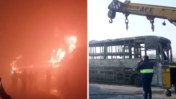 #WATCH मथुरा, यूपी | दिल्ली-आगरा एक्सप्रेसवे पर कई बसों में आग लग गई। जानमाल के नुकसान की आशंका है अधिक जानकारी की प्रतीक्षा है। pic.twitter.com/MfOsYY6Q5o
