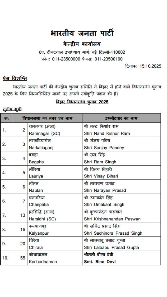 Bihar Election 2025 : नई दिल्ली। भारतीय जनता पार्टी ने बुधवार शाम बिहार विधानसभा चुनाव के लिए 18 उम्मीदवारों की अपनी तीसरी सूची जारी की, जिसमें कोचाधामन सीट से बीना देवी और मोहनिया से संगीता कुमारी को मैदान में उतारा गया है। सूची के अनुसार संजय पांडे नरकटियागंज सीट से, सतीश कुमार यादव राघोपुर से और भरत बिंद भभुआ से चुनाव लड़ेंगे।