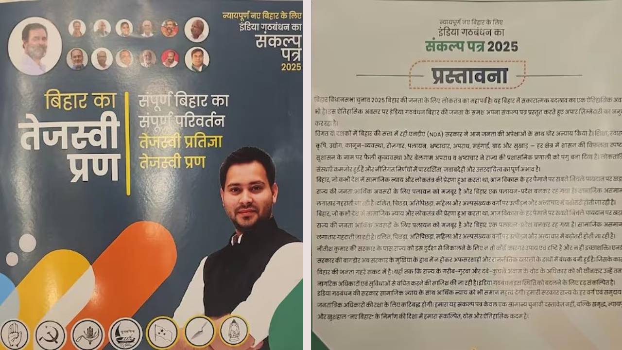 Bihar Election 2025 : बिहार विधानसभा चुनाव 2025 को देखते हुए महागठबंधन ने अपना घोषणापत्र जारी किया है। इस घोषणापत्र का नाम ‘तेजस्वी प्रण’ रखा गया है, जिसका कवर पेज पूरी तरह तेजस्वी यादव की नेतृत्वकारी छवि को दर्शाता है। तेजस्वी यादव की अगुवाई में जारी इस संकल्प पत्र में रोजगार, सामाजिक न्याय, महिला सशक्तिकरण और किसानों के हितों को प्रमुख प्राथमिकता दी गई है। गठबंधन ने कहा कि यह घोषणापत्र केवल एक चुनावी दस्तावेज नहीं, बल्कि समृद्ध, समान और न्यायपूर्ण बिहार के निर्माण का ऐतिहासिक वादा है।