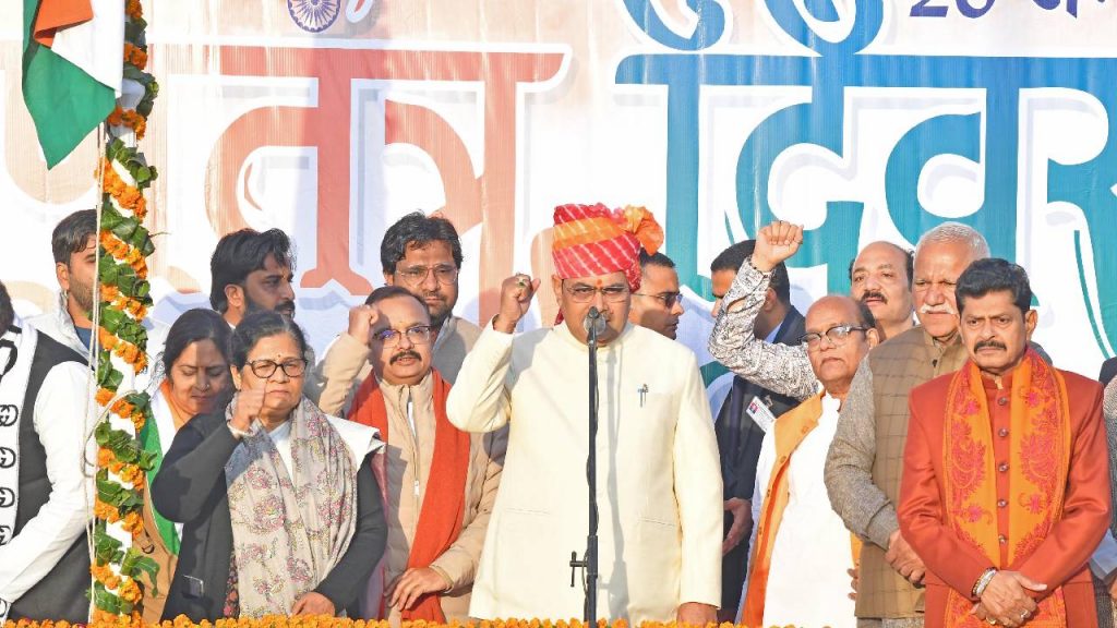 Jaipur Badi Chaupad Flag Hoisting : जयपुर। जयपुर की ऐतिहासिक बड़ी चौपड़ पर गणतंत्र दिवस के अवसर पर भारतीय जनता पार्टी की ओर से आयोजित समारोह में मुख्यमंत्री भजनलाल शर्मा (CM Bhajan Lal Sharma) ने ध्वजारोहण किया। इस अवसर पर उन्होंने देश के स्वतंत्रता सेनानियों को नमन करते हुए कहा कि उनके त्याग और बलिदान से ही आज हम स्वतंत्र भारत में लोकतांत्रिक व्यवस्था के तहत जीवन जी रहे हैं। मुख्यमंत्री ने संविधान निर्माता डॉ. भीमराव अंबेडकर सहित उन सभी महान व्यक्तियों को भी श्रद्धांजलि अर्पित की, जिन्होंने दुनिया का सबसे बड़ा लिखित संविधान देश को दिया।