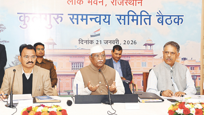 उप मुख्यमंत्री और उच्च शिक्षा मंत्री प्रेमचंद बैरवा ने कहा कि नेक रैंकिंग के अंतर्गत विश्वविद्यालयों में शिक्षकों की भर्ती के लिए प्रस्ताव मांगे गए हैं। उन्होंने कहा कि रिक्त पदों का रोस्टर बनाकर उन्हें भरने की कार्यवाही जल्द की जाएगी। विश्वविद्यालयों में पेंशन और अन्य आवश्यक सुविधाओं, भवन आदि के लिए उन्होंने मुख्यमंत्री स्तर पर चर्चा कर सकारात्मक कार्यवाहीं किए जाने का विश्वास दिलाया। उच्च शिक्षा विभाग के अतिरिक्त मुख्य सचिव कुलदीप रांका ने विश्वविद्यालयों में ग्लोबल टेलेंट रिटर्न स्कीम, प्रोफेसर ऑफ प्रैक्टिस, रिक्त पद भरने, कौशल विकास के बारे में की जा रही कार्यवाही के बारे में जानकारी दी।आयुर्वेद एवं भारतीय चिकित्सा पद्धति विभाग के प्रमुख सचिव सुबीर कुमार, पशुपालन विभाग के सचिव डॉ.समित शर्मा, वित्त विभाग की सचिव टीना सोनी, चिकित्सा शिक्षा विभाग के ललित कुमार, समाज कल्याण विभाग के आयुक्त इकबाल खान ने भी विचार रखे। राज्यपाल के सचिव डॉ. पृथ्वी ने विश्वविद्यालयों के स्तर पर गुणवत्ता सुधार, नई शिक्षा नीति लागू करने के बारे में जानकारी दी। शुरुआत में राज्य के वित्तपोषित विश्वविद्यालयों के कुलगुरुओं ने अपने-अपने यहां किए जा रहे नवाचारों, नेक एक्रेडिटेशन, नई शिक्षा नीति को लागू किए जाने के सम्बन्ध में की जा रही कार्यवाही के बारे में बताया।