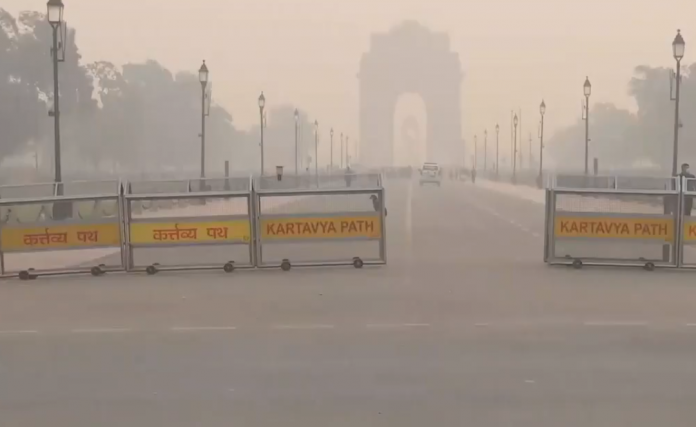 #WATCH दिल्ली | इंडिया गेट और कर्तव्य पथ के आसपास का क्षेत्र जहरीली धुंध की घनी परत में लिपटा हुआ है। CPCB के अनुसार इस क्षेत्र में AQI 396 'बहुत खराब' श्रेणी में है। pic.twitter.com/TZ7aSMoMxQ