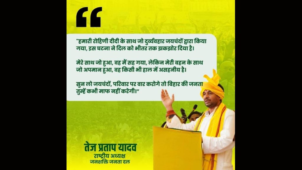 तेज प्रताप ने कहा, “आज यही जयचंद लालच और चापलूसी के चलते परिवार और संगठन—दोनों को नुकसान पहुंचा रहे हैं। मेरे पिता पहले से ही बीमार हैं, वह ऐसा भावनात्मक दबाव बर्दाश्त नहीं कर सकते।” यादव ने सरकार से यह भी मांग की कि यदि उनकी बहन, मां या पिता के साथ बदसलूकी, धक्का-मुक्की की गई, गालियां दीं गईं या मानसिक/शारीरिक उत्पीड़न किया गया तो संजय यादव, रमीज नेमत खान और प्रीतम यादव जैसे लोगों पर तुरंत प्राथमिकी दर्ज की जानी चाहिए।एक अन्य पोस्ट में उन्होंने कहा, “हमारी बहन का अपमान किसी भी स्थिति में बर्दाश्त नहीं किया जाएगा… जयचंदों को अपने कर्मों का फल भुगतना पड़ेगा।” उन्होंने लिखा, “रोहिणी दीदी के साथ जो हुआ, उसने मुझे भीतर तक हिला दिया है। मेरे साथ जो हुआ, उसे सह लिया, लेकिन अपनी बहन का अपमान नहीं सह सकता। बिहार की जनता इन्हें कभी माफ नहीं करेगी।”