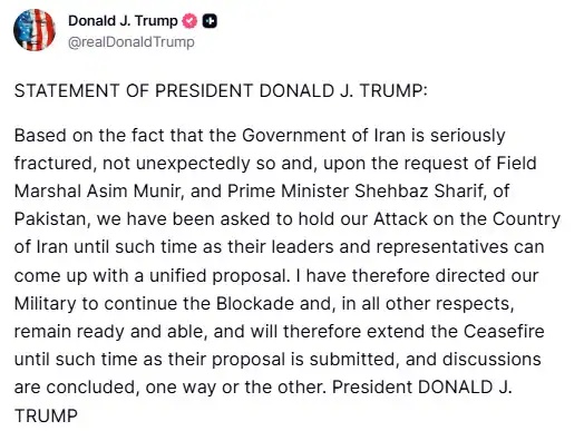 ट्रंप ने एक बयान में कहा, ‘इस तथ्य के आधार पर कि ईरान की सरकार गंभीर रूप से आंतरिक मतभेदों से जूझ रही है और पाकिस्तान के फील्ड मार्शल आसिम मुनीर और प्रधानमंत्री शहबाज शरीफ के अनुरोध पर हमसे कहा गया है कि हम ईरान पर अपने हमले को तब तक रोकें, जब तक उसके नेता और प्रतिनिधि समेकित प्रस्ताव तैयार नहीं कर लेते.”इसलिए अपनी सेना को नाकेबंदी जारी रखने तथा अन्य सभी मामलों में पूरी तरह तैयार और सक्षम रहने का निर्देश दिया है.