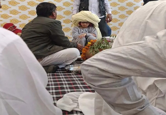 जयपुर। फागी के रामचंद्रपुरा की 7 साल की भव्या चौधरी ने दादा के देहांत के बाद पगड़ी रस्म पूरी की। पगड़ी रस्म के वक्त गांव में रहने वाले सभी लोगों की आंखे छलक पड़ी । मासूम सी बच्ची के कंधों पर पूरे परिवार की जिम्मेदारी और उसके बचपन को देखते हुए हर आदमी की आंखे नम हो गई। वहीं मासूम बच्ची ने अपना दिल मजबूत करते हुए हर रस्म को हंसते हुए पूरा किया।