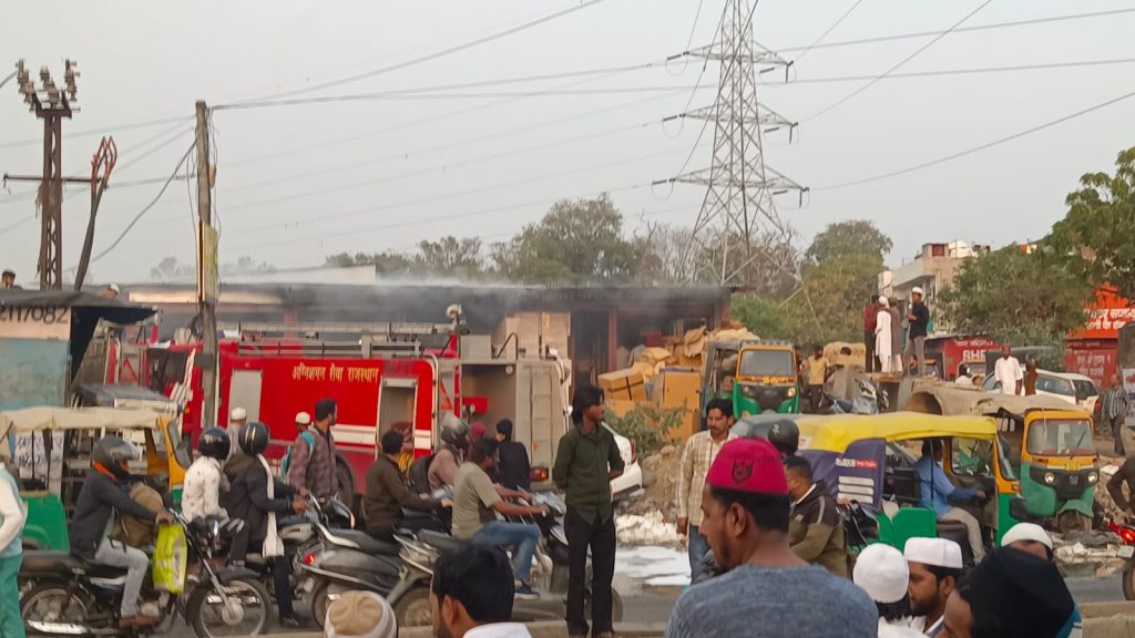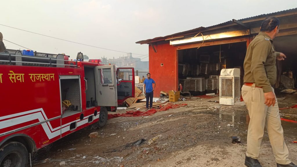 Jaipur Cooler Factory Fire: जयपुर। सदर थाना इलाके में शुक्रवार दोपहर कूलर की टाटिया और पैड्स बनाने वाली फैक्ट्री में अचानक से आग लग गई। जिसके बाद आग ने विकराल रूप धारण कर लिया और पास ही की चार दुकानों के बाहर रखे सामान को भी अपनी चपेट में ले लिया और चारों दुकानों के बाहर रखा सामान भी जल कर राख हो गया।