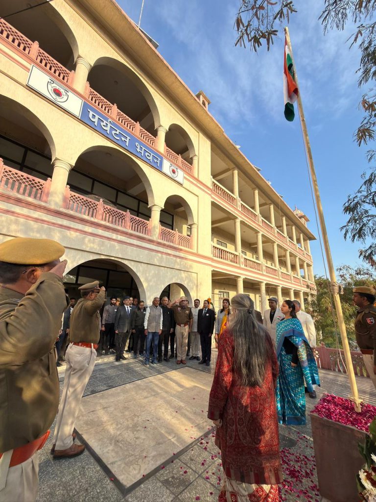 पर्यटन आयुक्त ने सभी उपस्थित अधिकारियों एवं कर्मचारियों को गणतंत्र दिवस की शुभकामनाएं देते हुए अपने उद्बोधन में कहा कि आज के दिन भारत देश का संविधान लागू हुआ था, जिससे हमें हमारे मौलिक अधिकार एवं दायित्व प्राप्त हुए हैं। अपने राष्ट्र को निरंतर प्रगतिमान करने के लिए हम सभी को अपने कर्तव्यों का पालन कर योगदान देना चाहिए।