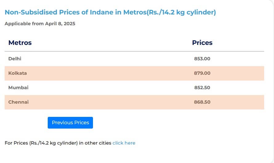14.2 kg वाले घरेलू LPG सिलेंडर की बात की जाए तो इसकी कीमतों में कोई बदलाव नहीं किया है. आखिरी बार अप्रैल 2025 में घरेलू गैस सिलेंडर के दाम 50 रुपए बढ़ाए गए थे. दिल्ली में घरेलू गैस सिलेंडर की कीमत 853 रुपए. कोलकाता में इस सिलेंडर की कीमत 879 रुपए, मुंबई में इसकी कीमत 852.50 रुपए है, जबकि चेन्नई में ये 868.50 रुपए में मिल रहा है.
