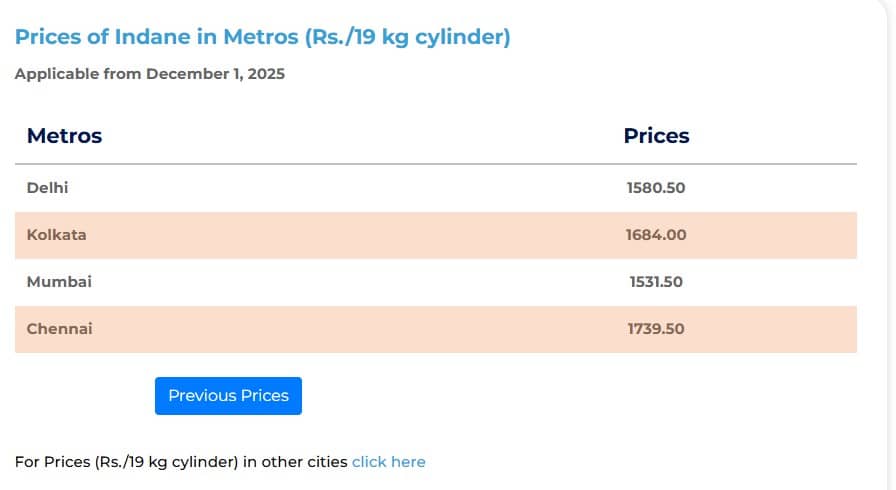 इंडियन ऑयल कॉर्पोरेशन लिमिटेड(IOCL) की बेवसाइट के मुताबिक, दिल्ली में कमर्शियल सिलेंडर 1580.50 रुपए में मिलेगा. कोलकाता में कमर्शियल सिलेंडर 1684 रुपए में मिलेगा. मुंबई में 19 किलो वाला कमर्शियल सिलेंडर 1531.50 रुपए का मिलेगा, जबकि चेन्नई में ये सिलेंडर 1739.50 रुपए में मिलेगा.