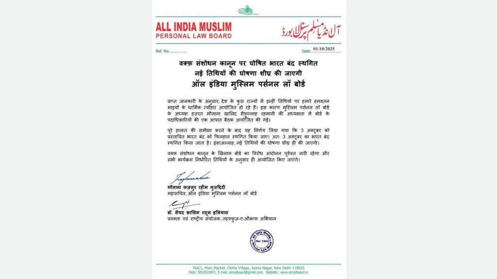 बोर्ड के महासचिव मौलाना फजलुर रहीम मुजद्दिदी और बोर्ड के प्रवक्ता सैयद कासिम रसूल इलियास द्वारा जारी एक बयान में कहा गया है कि त्यौहारों को देखते हुए देखते हुए बोर्ड के अध्यक्ष मौलाना खालिद सैफुल्लाह रहमानी की अध्यक्षता में एआईएमपीएलबी के पदाधिकारियों की एक आपात बैठक बुलाई गई। उन्होंने कहा कि स्थिति की विस्तृत समीक्षा के बाद, 3 अक्टूबर को होने वाले ‘भारत बंद’ को स्थगित करने का निर्णय लिया गया।