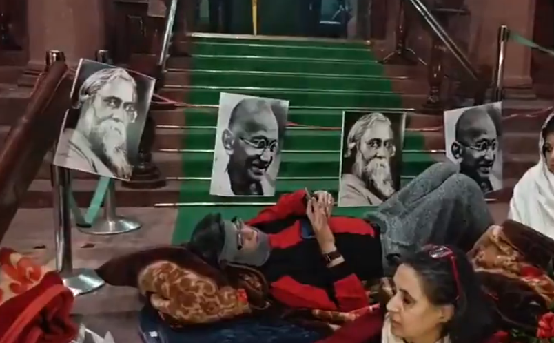 #WATCH दिल्ली | TMC सांसद वीबी जी-राम जी बिल 2025 के खिलाफ अपने 12 घंटे के विरोध प्रदर्शन पर बैठे हुए हैं, जिसे संसद के दोनों सदनों में पास कर दिया गया है। pic.twitter.com/oMvOjpPZqB