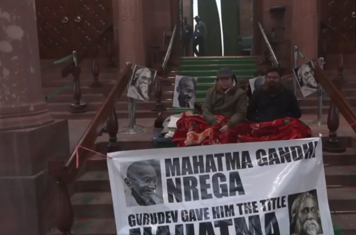 #WATCH दिल्ली | TMC सांसद वीबी जी-राम जी बिल 2025 के खिलाफ अपने 12 घंटे के विरोध प्रदर्शन पर बैठे हुए हैं, जिसे संसद के दोनों सदनों में पास कर दिया गया है। pic.twitter.com/oMvOjpPZqB