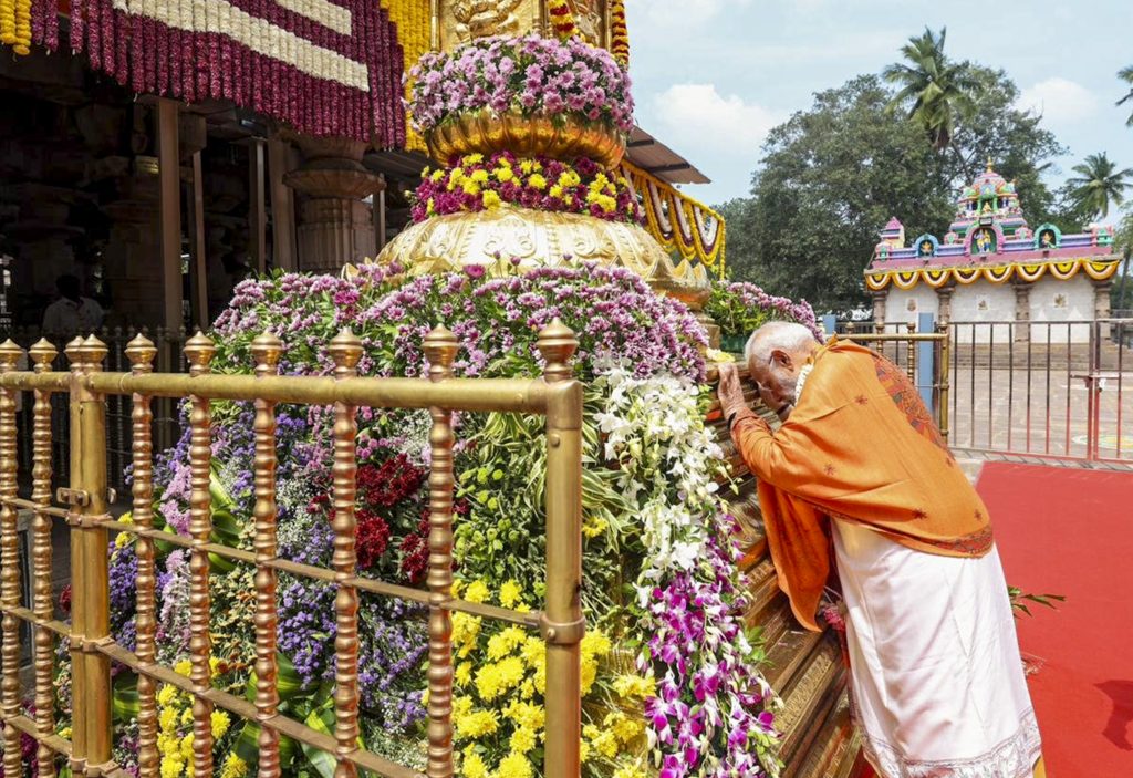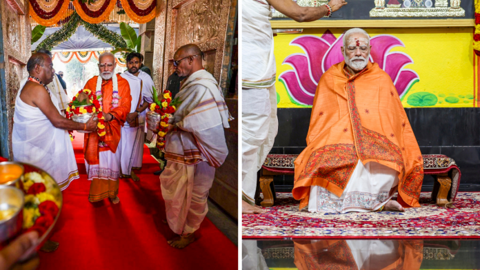 #WATCH | आंध्र प्रदेश: प्रधानमंत्री नरेंद्र मोदी ने नंद्याल जिले के श्रीशैलम के 'भ्रमरम्बा मल्लिकार्जुन स्वामी मंदिर' में पूजा और दर्शन किए।