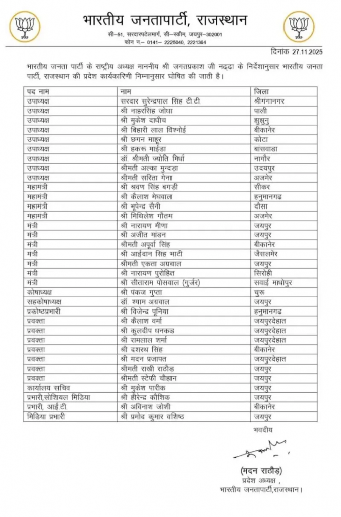 इसके अनुसार सुरेंद्र पाल सिंह टी टी, नाहर सिंह जोधा, मुकेश दाधीच, बिहारी लाल बिश्नोई, छगन माहुर, हकरू माइड़ा, ज्योति मिर्धा, अलका मूंदड़ा और सरिता गेना को प्रदेश उपाध्यक्ष नियुक्त किया गया है. कांग्रेस की पूर्व सांसद मिर्धा 2023 के विधानसभा चुनाव से पहले भाजपा में शामिल हुई थीं.