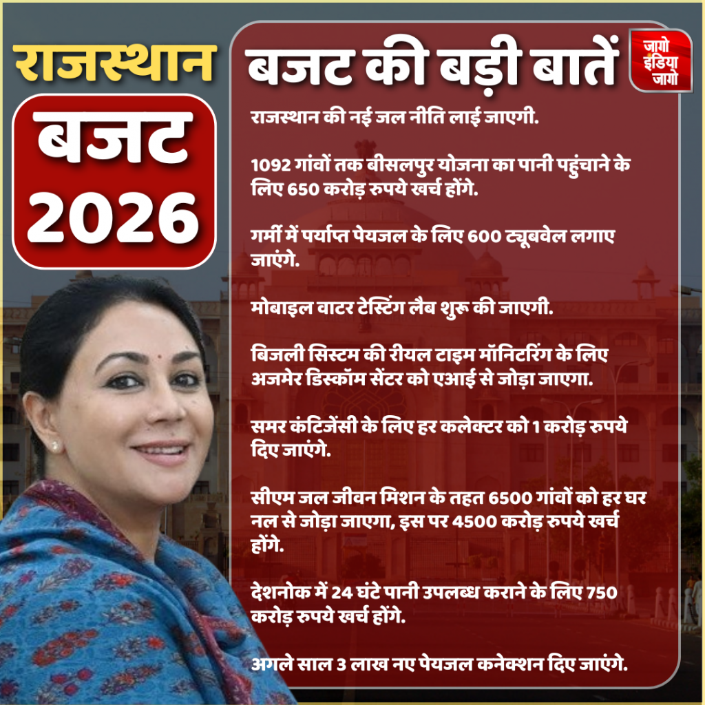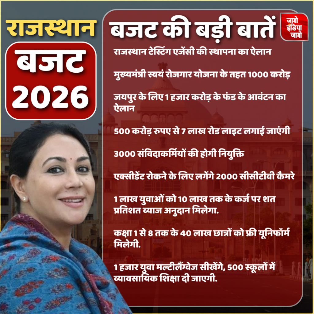 Rajasthan Budget 2026 LIVE: राजस्थान विधानसभा में वित्त मंत्री दिया कुमारी 2026-27 का बजट पेश कर रहीं। राज्य बजट 2026-27 ना केवल प्रदेश की अर्थव्यवस्था का रोडमैप तय करेगा, बल्कि आम आदमी की जेब, रोजगार, किसानों की समृद्धि और बुनियादी ढांचे पर सीधा असर डालेगा। राजनीतिक और आर्थिक विशेषज्ञों के अनुसार यह बजट ‘जनता की उम्मीदों’ और ‘विकास की गारंटी’ के बीच संतुलन बनाने वाला होगा। उम्मीद जताई जा रही है कि सरकार पर्यटन, इंफ्रास्ट्रक्चर, उद्योग, शहर की ट्रैफिक व्यवस्था और रोजगार को लेकर बड़ी घोषणाएं कर सकती है। साथ ही, बढ़ते शहरीकरण के बीच पर्यावरण सुरक्षा, ई-व्हीकल्स, पीएम सूर्य घर योजना, कुसुम योजना, ग्रीन एनर्जी कॉरिडोर, मेट्रो परियोजना सहित महिलाओं को आत्मनिर्भर बनाने की दिशा में बड़े निर्णय लिए जा सकते हैं।