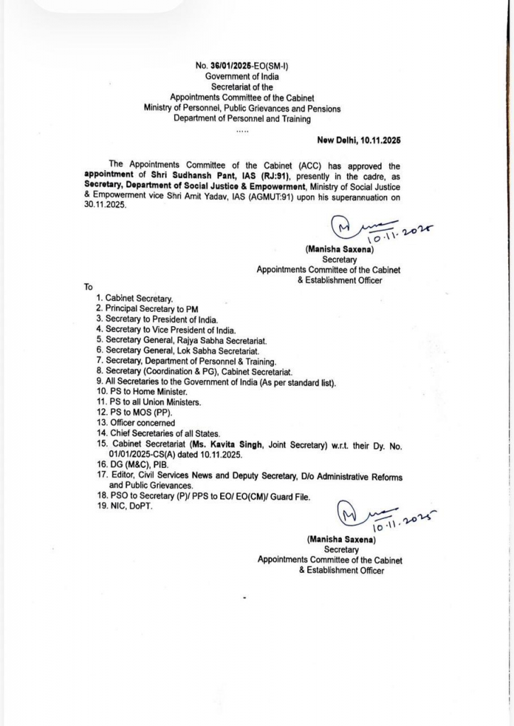 कार्मिक एवं प्रशिक्षण विभाग (भारत सरकार) द्वारा सोमवार को जारी आदेश के अनुसार कैबिनेट की नियुक्ति समिति ने सामाजिक न्याय एवं अधिकारिता मंत्रालय के सामाजिक न्याय एवं अधिकारिता विभाग के सचिव पद पर अमित यादव के स्थान पर पंत की नियुक्ति को मंजूरी दे दी है. यादव 30 नवंबर को सेवानिवृत्त होने वाले हैं.