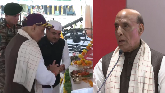 रक्षा मंत्री ने थलसेना, वायुसेना और नौसेना को भारत की ताकत के ‘‘तीन स्तंभ’’ बताया. उन्होंने कहा, ‘जब ये तीनों सेवाएं मिलकर काम करेंगी, तभी हम हर चुनौती का प्रभावी ढंग से सामना कर पाएंगे. रक्षा मंत्री ने सर क्रीक को लेकर भारत और पाकिस्तान के बीच सीमा विवाद का भी जिक्र किया. उन्होंने कहा, ‘भारत ने बार-बार बातचीत के जरिए इस मुद्दे को सुलझाने की कोशिश की है, लेकिन पाकिस्तान की नीयत अस्पष्ट है. सर क्रीक से सटे इलाकों में उसके सैन्य बुनियादी ढांचे का हालिया विस्तार उसकी नीयत को दर्शाता है.’ बता दें कि राजनाथ पिछले कई वर्षों से दशहरा पर शस्त्र पूजा करते आ रहे हैं. उन्होंने पिछली राष्ट्रीय जनतांत्रिक गठबंधन (राजग) सरकार में केंद्रीय गृह मंत्री के रूप में भी शस्त्र पूजा की थी।