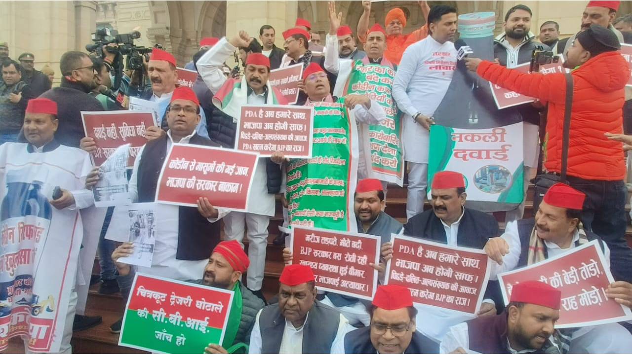 उत्तर प्रदेश विधानसभा में समाजवादी पार्टी के विधायकों ने कोडीन सिरप, SIR, लोक सेवा आयोग में विसंगतियां, खाद, धान खरीद, बेरोजगारी एवं महंगाई जैसे तमाम मुद्दों को लेकर भाजपा सरकार के खिलाफ विरोध प्रदर्शन किया।