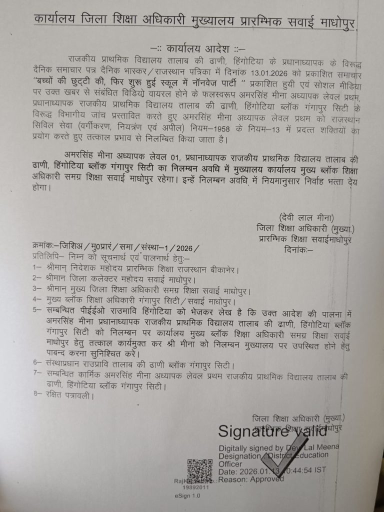 घटना का वीडियो सोशल मीडिया पर वायरल होने के बाद जिला शिक्षा अधिकारी (मुख्यालय) प्रारंभिक शिक्षा ने मामले में कार्रवाई करते हुए हेड मास्टर अमर सिंह मीणा को सस्पेंड कर दिया है. निलंबन की अवधि के दौरान उनका मुख्यालय ‘मुख्य ब्लॉक शिक्षा अधिकारी, समग्र शिक्षा सवाईमाधोपुर रहेगा.
