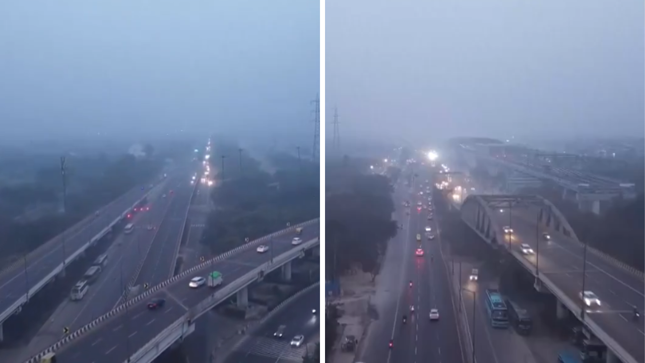 #WATCH | दिल्ली: राष्ट्रीय राजधानी में शीतलहर के साथ स्मॉग की परत छाई हुई है। ड्रोन वीडियो सराय काले खां से है। pic.twitter.com/pxuoXy26P6