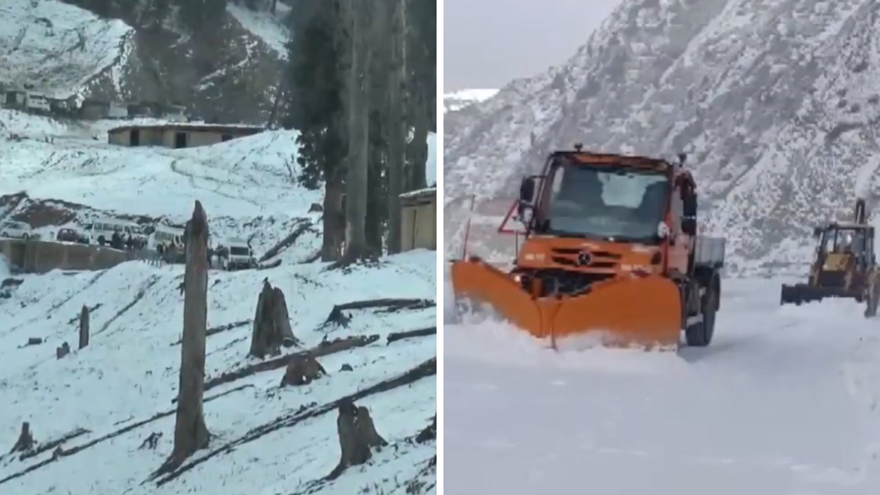 #WATCH | पुंछ, जम्मू-कश्मीर: भारी बर्फबारी के बाद मुगल रोड पर बर्फ हटाने का अभियान जारी है।