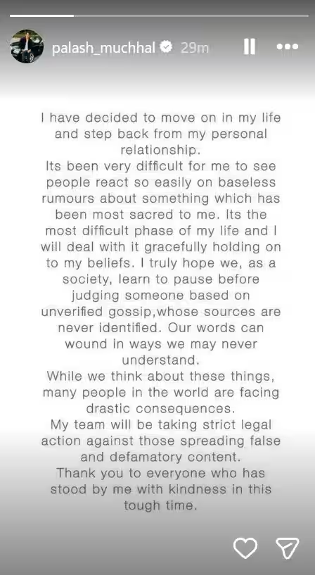 पलाश ने आगे लिखा- मुझे सच में उम्मीद है कि हम, एक समाज के रूप में, किसी के बारे में बिना पुष्टि की गई गॉसिप के आधार पर राय बनाने से पहले रुकना सीखेंगे, जिनके सोर्स कभी पता नहीं चलते. हमारे शब्द किसी को ऐसी चोट पहुंचा सकते हैं जिस हम शायद कभी समझ न पाएं. मेरी टीम झूठी और बदनाम करने वाली बातें फैलाने वालों के खिलाफ सख्त कानूनी कार्रवाई करेगी. इस कठिन समय में मेरे साथ खड़े रहने वाले सभी लोगों का धन्यवाद.