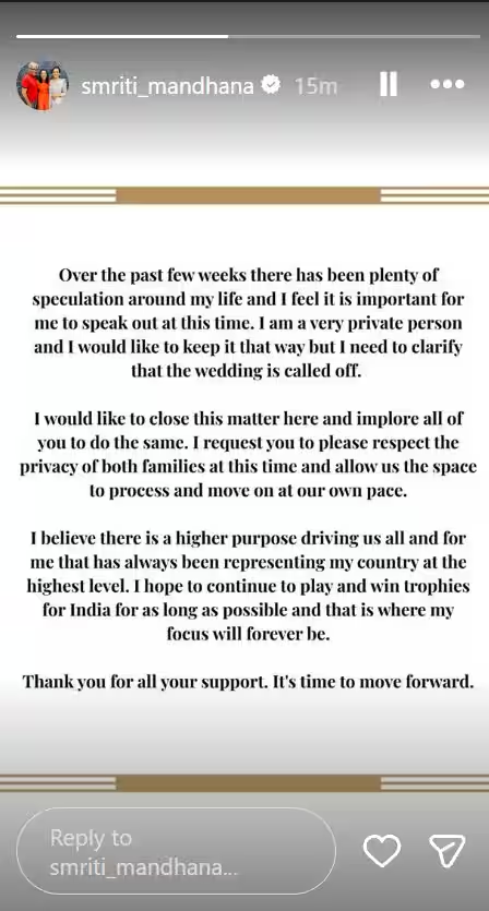 स्मृति मंधाना ने इंस्टाग्राम पोस्ट में लिखा कि पिछले कुछ हफ़्तों से मेरे जीवन को लेकर काफ़ी अटकलें लगाई जा रही हैं और मुझे लगता है कि इस समय मेरे लिए खुलकर बोलना ज़रूरी है. मैं एक बहुत ही प्राइवेट इंसान हूं और मैं इसे ऐसे ही रखना चाहूंगी, लेकिन मुझे यह स्पष्ट करना है कि शादी कैंसिल हो गई है.