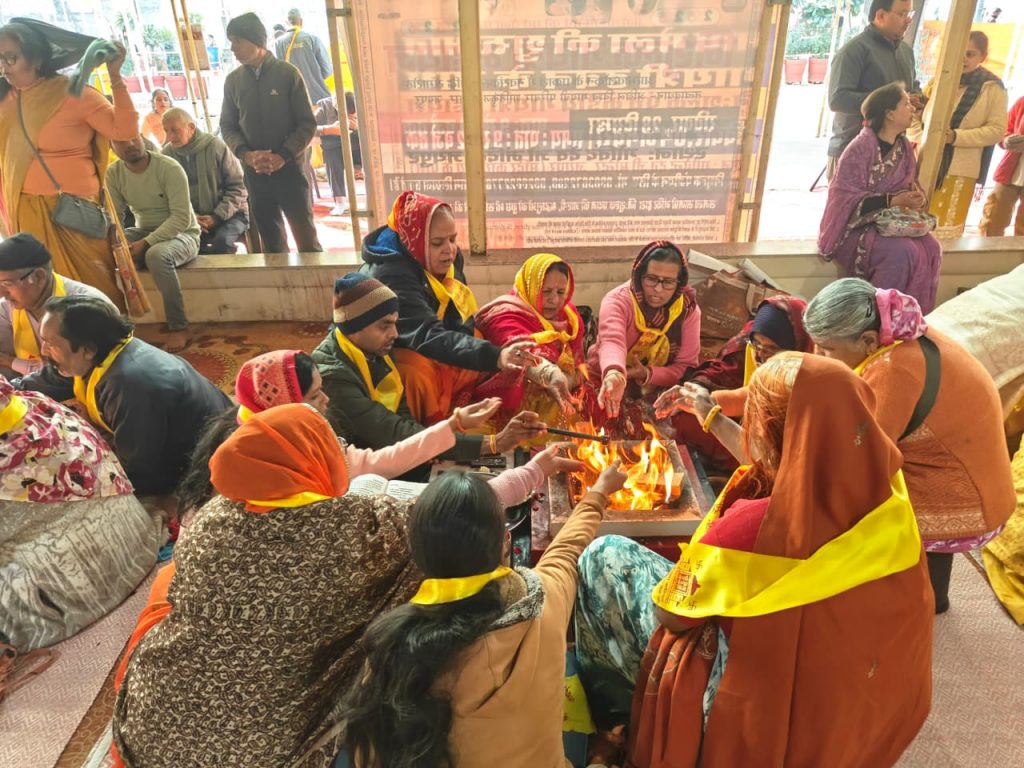मंदिर महंत अंजन कुमार गोस्वामी महाराज के सानिध्य में गंगा-यमुना-सरस्वती का वैदिक मंत्रोच्चार के साथ भावपूर्ण आह्वान कर त्रिवेणी संगम जल से पूरित कलश का षोडशोपचार पूजन किया गया। आचार्य पीठ से गायत्री कचोलिया एवं गायत्री तोमर ने प्रज्ञा गीतों के सुमधुर गायन के साथ यज्ञ संपादित कराया। तीन पारियों में संपन्न हुए पंच कुंडीय गायत्री महायज्ञ में 250 से अधिक श्रद्धालुओं ने सहभागिता करते हुए यज्ञ भगवान को श्रद्धापूर्वक आहुतियां अर्पित कीं. महायज्ञ में विराजमान श्रद्धालुओं पर त्रिवेणी संगम जल से अभिसिंचन किया गया।