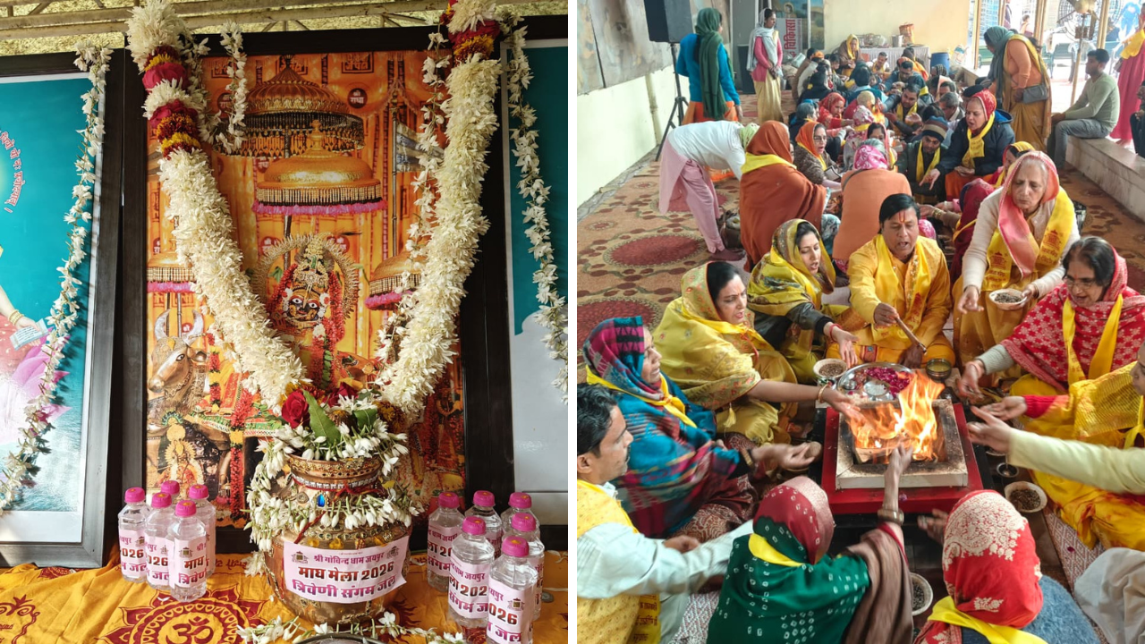 जयपुर। प्रयागराज के त्रिवेणी संगम पर चल रहे माघ मेला के अवसर पर रविवार को गोविंद देवजी मंदिर परिसर में पंच कुंडीय गायत्री महायज्ञ के साथ त्रिवेणी संगम जल कलश का पूजन किया गया । कार्यक्रम का शुभारंभ गोविंद देवजी मंदिर के सेवा अधिकारी मानस गोस्वामी ने ठाकुर श्री राधा गोविंद देवजी, मां गायत्री एवं गुरु सत्ता के समक्ष दीप प्रज्ज्वलन कर किया।