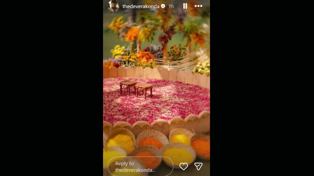 Vijay Deverakonda Rashmika Wedding : उदयपुर। तेलुगु फिल्म स्टार विजय देवरकोंडा ने बुधवार को अभिनेत्री रश्मिका मंदाना के साथ अपनी शादी से पहले हल्दी समारोह की झलकियां साझा की। उदयपुर के बाहरी इलाके में स्थित एक लक्जरी होटल में बृहस्पतिवार को दोनों कलाकार शादी के बंधन में बंध जाएंगे। विवाह से जुड़ी रस्में पिछले दो दिनों से जारी हैं। विजय ने अपने इंस्टाग्राम स्टोरी के माध्यम से प्रशंसकों को हल्दी समारोह की भव्य तैयारियों की एक झलक दिखाई। इन दृश्यों में एक गोलाकार बाहरी स्थान दिख रहा है, जिसके केंद्र में दूल्हा और दुल्हन के लिए लकड़ी के दो छोटे स्टूल रखे गए हैं और इस पूरे क्षेत्र को पीले और नारंगी गेंदे के फूलों की पंखुड़ियों वाली टोकरियों से घेरा गया है।